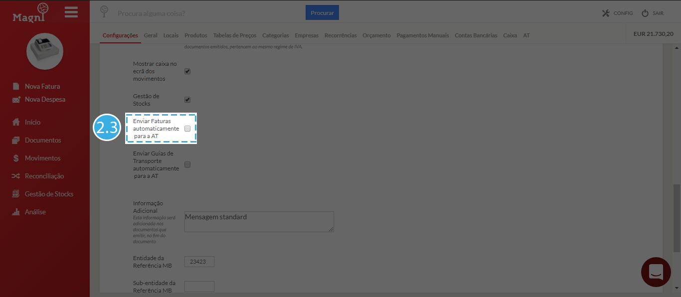 2.3 - Arraste a página para baixo até aparecer o campo Enviar Faturas automaticamente para a AT. Nesse campo, clique para activar o envio automático para a AT.